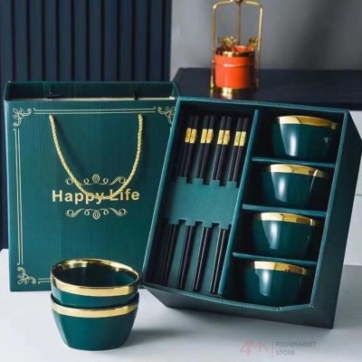 | Tên sản phẩm | Bộ bát chén happy life bát ăn cơm gốm sứ viền vàng kèm 6 đôi đũa và hộp đẹp có thể làm quà tặng |