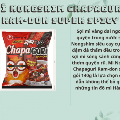 Thông tin sản phẩm: Sợi mì vàng dai ngon hòa quyện trong nước súp mì Nongshim siêu cay cực đã cực đậm đà thấm đều trong từng sợi mì sóng sánh cùng hương thơm quyến rũ. Mì Nongshim Chapaguri Ram-don siêu cay gói 140g là lựa chọn cực hấn dẫn không thể bỏ qua cho những tín đồ mì Hàn Quốc