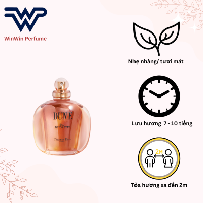 Dune, một cảm giác thật tươi mát, huyền ảo và lấp lánh như thể bạn đang dạo bước trên bãi cát dọc bờ biển trong một ngày nắng đẹp và tân hưởng những cơn gió biển mát rượi pha lẫn hương vị mặn nồng đẩy sức sống của đại dương. Những thành phần nguyên liệu phong phú và mới lạ sẽ mang đến cho bạn một cảm nhận thật sự mới mẻ và phấn khởi.
