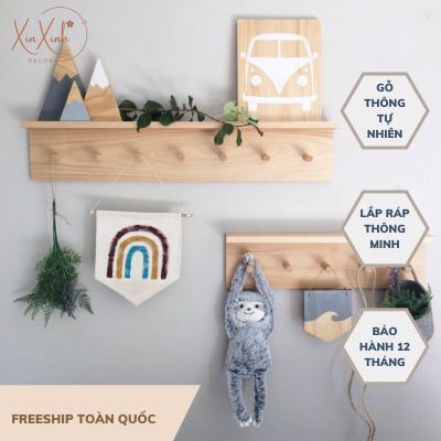 Giá treo tường gắn 6 móc treo quần áo trang trí decor, chất liệu gỗ cao cấp