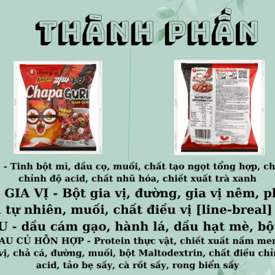 Thành phần: SỢI MÌ - Tinh bột mì, dầu cọ, muối, chất tạo ngọt tổng hợp, chất điều chỉnh độ acid, chất nhũ hóa, chiết xuất trà xanh GÓI GIA VỊ - Bột gia vị, đường, gia vị nêm, phẩm màu tự nhiên, muối, chất điều vị [line-breal] GÓI DẦU - dầu cám gạo, hành lá, dầu hạt mè, bột ớt GÓI RAU CỦ HỖN HỢP - Protein thực vật, chiết xuất nấm men, chất điều vị, chả cá, đường, muối, bột Maltodextrin, chất điều chỉnh độ acid, tảo bẹ sấy, cà rốt sấy, rong biển sấy