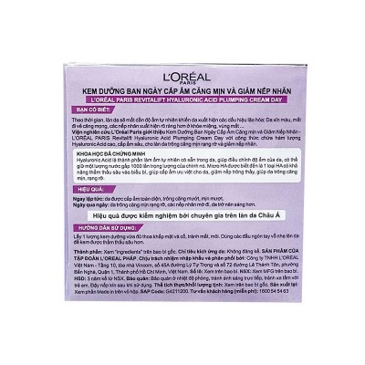 | Tên sản phẩm | Kem Dưỡng L’Oreal Paris Siêu Cấp Ẩm Căng Min Da Revitalift Hyaluronic Acid Plumping Day Cream 50ml |