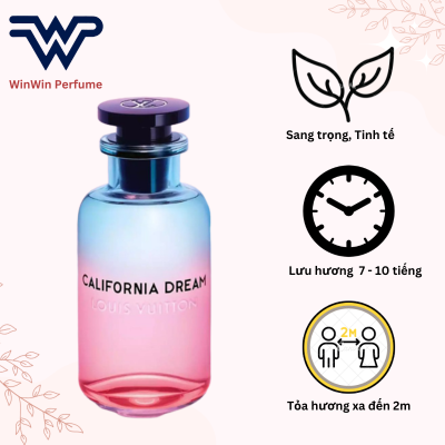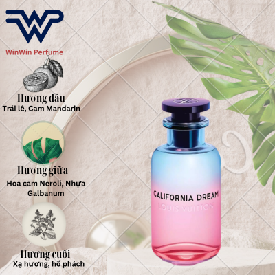 - Louis Vuitton California Dream, mẫu nước hoa Cologne mới nhất của Louis Vuitton. Đó là sự kéo dài của một ngày hoàn hảo. Ngắm màn đêm buông xuống. Chìm đắm trong những sắc màu. Đứng trước chân trời và tận hưởng hương thơm óng ánh lấp lánh này. Người pha chế Jacques Cavallier Belletrud đã giữ lấy khoảnh khắc hoàng hôn trên đất California mãi mãi trong hương thơm nước hoa này, vì thế mà nó đã được đặt tên California Dream.